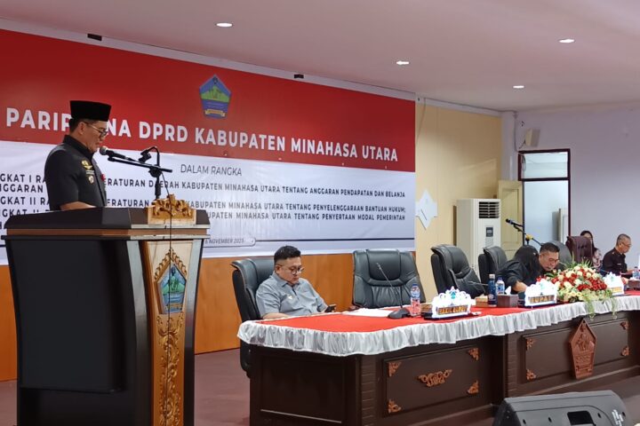 Airmadidi, TERASMANADO.COM – Pemerintah Kabupaten Minahasa Utara terus memperkuat kolaborasi antara eksekutif dan legislatif dalam upaya mewujudkan tata kelola pemerintahan yang transparan dan berpihak pada masyarakat. Hal ini ditegaskan oleh Bupati Minahasa Utara Joune Ganda, saat menghadiri Rapat Paripurna DPRD Kabupaten Minahasa Utara, Kamis (6/11/2025), bersama Wakil Bupati Kevin William Lotulung. Rapat yang dipimpin Ketua DPRD Vonny Adel Rumimpunu itu