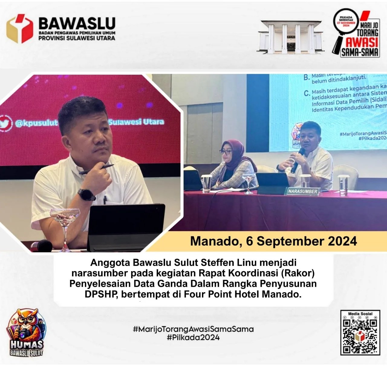 TERASMANADO.COM, Manado – Anggota Bawaslu Sulut Steffen Linu menjadi narasumber pada kegiatan Rapat Koordinasi (Rakor) Penyelesaian Data Ganda Dalam Rangka Penyusunan DPSHP, bertempat di Four Point Hotel Manado, Jumat (6/9/2024).