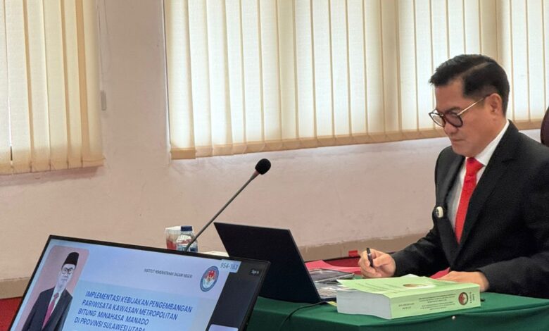 Ujian berlangsung di Ruang Sidang II Sekolah Pascasarjana IPDN Jakarta, dipimpin Ketua Sidang sekaligus Direktur IPDN Jakarta, Prof. Dr. Muhadam Labolo, M.Si. Dalam kesempatan tersebut, Joune Ganda memaparkan disertasi berjudul “Implementasi Kebijakan Pengembangan Pariwisata Kawasan Metropolitan Bitung Minahasa Manado di Provinsi Sulawesi Utara.”