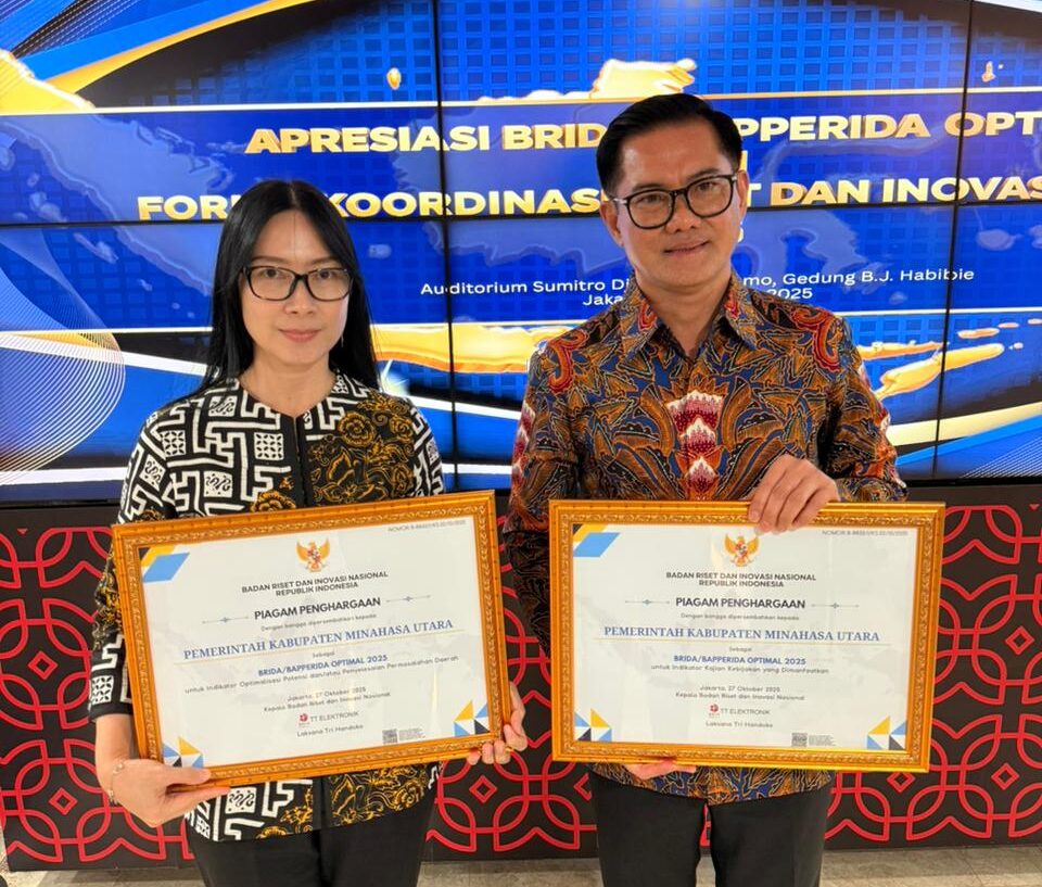 Penghargaan diserahkan langsung oleh Kepala BRIN, Laksana Tri Handoko, kepada Bupati Minahasa Utara Joune Ganda dalam acara Apresiasi BRIDA/BAPPERIDA Optimal 2025 yang digelar di Auditorium Sumitro Djojohadikusumo, Gedung B.J. Habibie, Jakarta, Senin (27/10/2025).