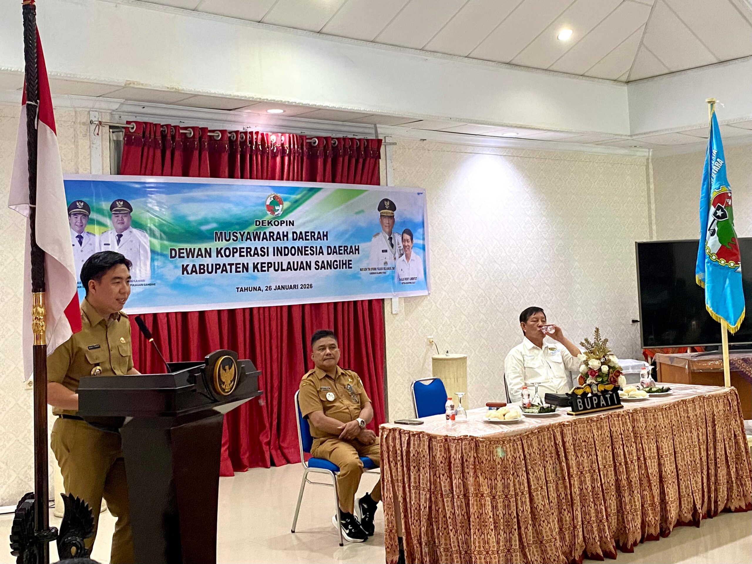 Sangihe, TERASMANADO.COM — Bupati Kepulauan Sangihe, Michael Thungari, secara resmi membuka Musyawarah Daerah Dewan Koperasi Indonesia Daerah (Dekopinda) Kabupaten Kepulauan Sangihe, yang digelar bersama jajaran Dewan Koperasi Indonesia Wilayah (Dekopinwil) Sulawesi Utara diruang Serbaguna Rumah Jabatan Bupati, Senin (26/01/2026).