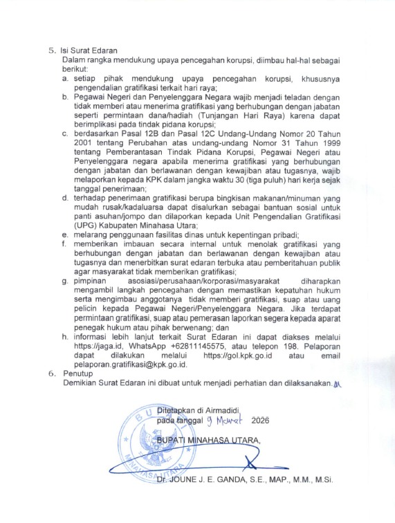 Airmadidi, TERASMANADO.COM – Bupati Minahasa Utara (Minut) Joune Ganda menerbitkan Surat Edaran Nomor 2 Tahun 2026 tentang Pencegahan Korupsi dan Pengendalian Gratifikasi Terkait Hari Raya Tahun 2026. Melalui edaran tertanggal 9 Maret 2026 ini, seluruh aparatur sipil negara (ASN) dan penyelenggara negara di lingkungan Pemerintah Kabupaten Minahasa Utara diminta untuk tidak menerima maupun memberikan gratifikasi yang berkaitan dengan jabatan menjelang perayaan hari raya.