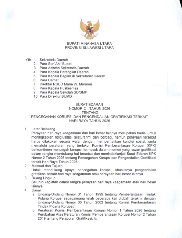 Surat edaran ini menurut Kepala Dinas Kominfo Minut Asriyadi Lalompoh, Selasa (10/03/2026), ditujukan kepada seluruh pimpinan perangkat daerah, camat hingga pimpinan BUMD, untuk memastikan jajaran Pemkab Minut mematuhi ketentuan tersebut. Langkah ini diambil sebagai upaya memperkuat integritas aparatur pemerintah sekaligus mencegah praktik korupsi yang kerap muncul dalam momentum hari raya.