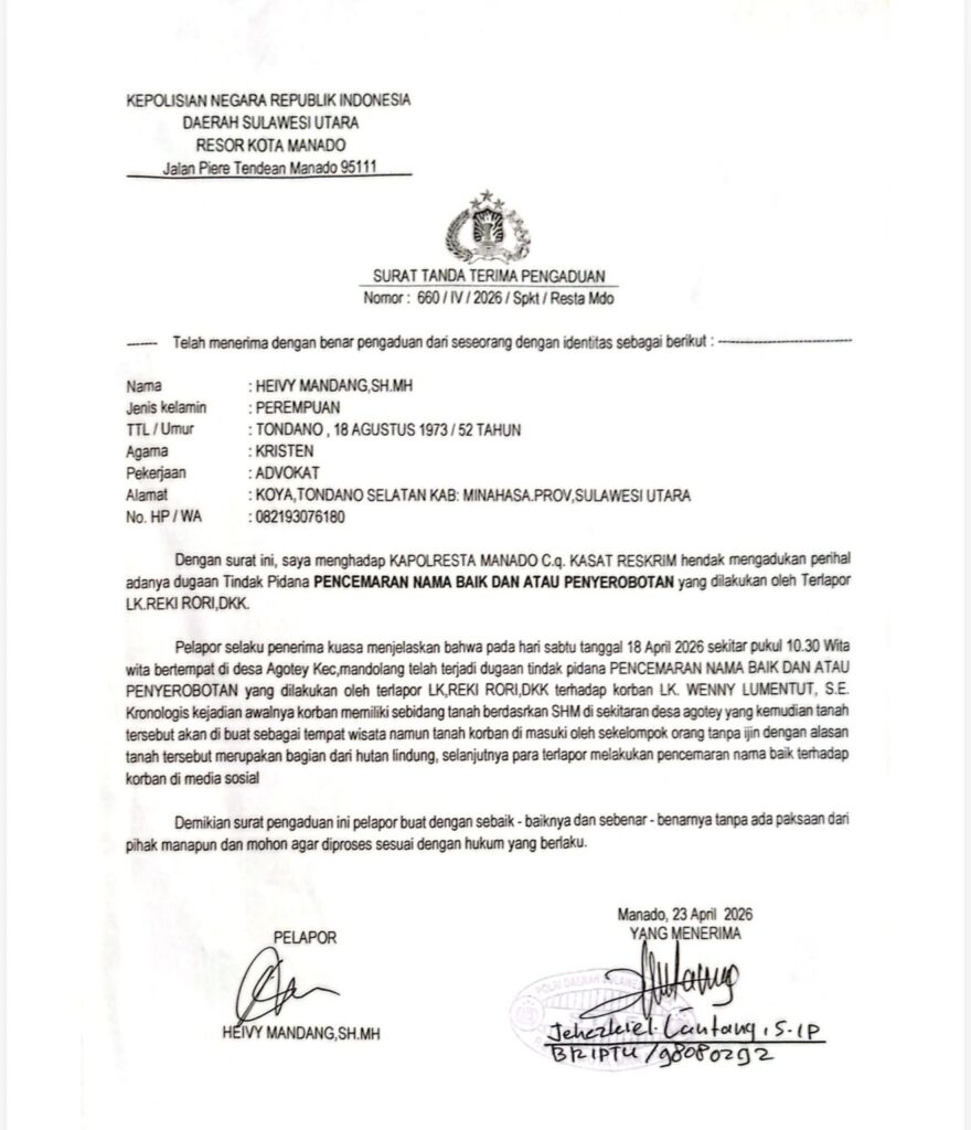 Laporan resmi dilayangkan melalui kuasa hukumnya, Heivy Mandang, pada Kamis (23/4/2026) pukul 14.30 WITA di Polresta Manado. Pihak Wenny Lumentut menengarai adanya keterlibatan aktor intelektual dalam menyebarkan informasi menyesatkan yang memicu keresahan warga.