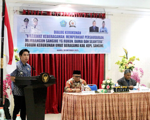 Sangihe, TERASMANADO.COM — Pemerintah Kabupaten Kepulauan Sangihe menggelar Dialog dan Pawai Kerukunan Umat Beragama dengan tema “Moderasi Beragama: Merawat Keberagaman, Memperkuat Persaudaraan, dan Membangun Sangihe yang Rukun, Damai, dan Sejahtera, Gerbang Kerukunan di Utara Indonesia”. Kegiatan yang berlangsung Rabu (30/10/2025) ini dibuka
